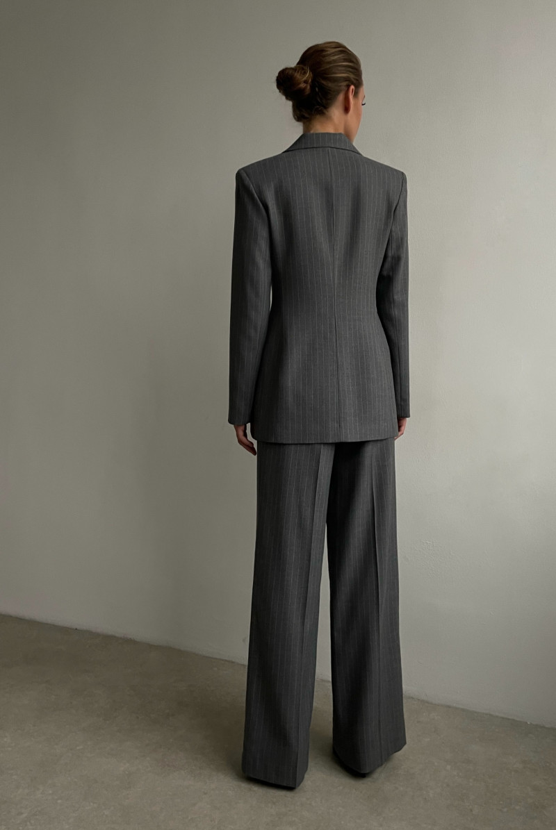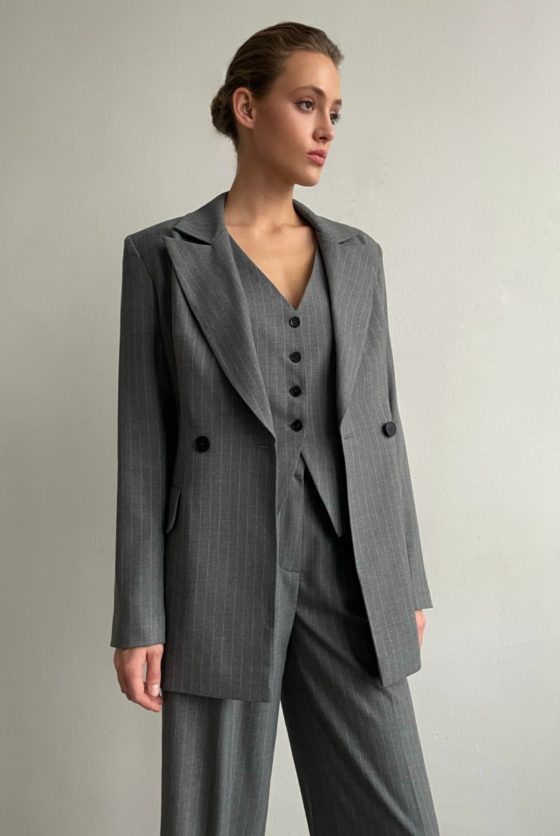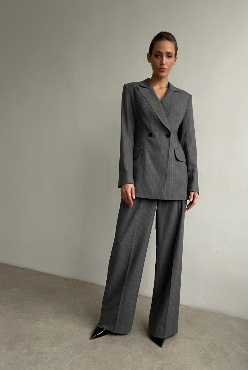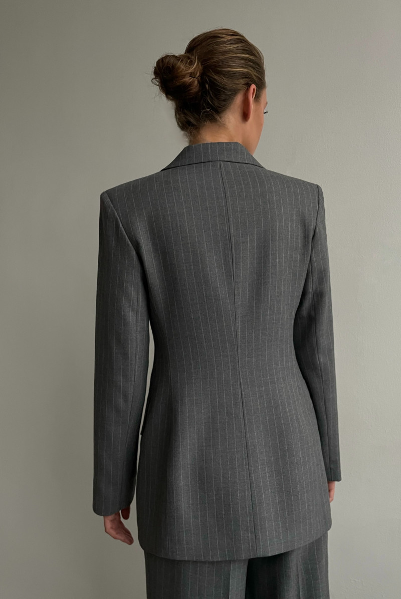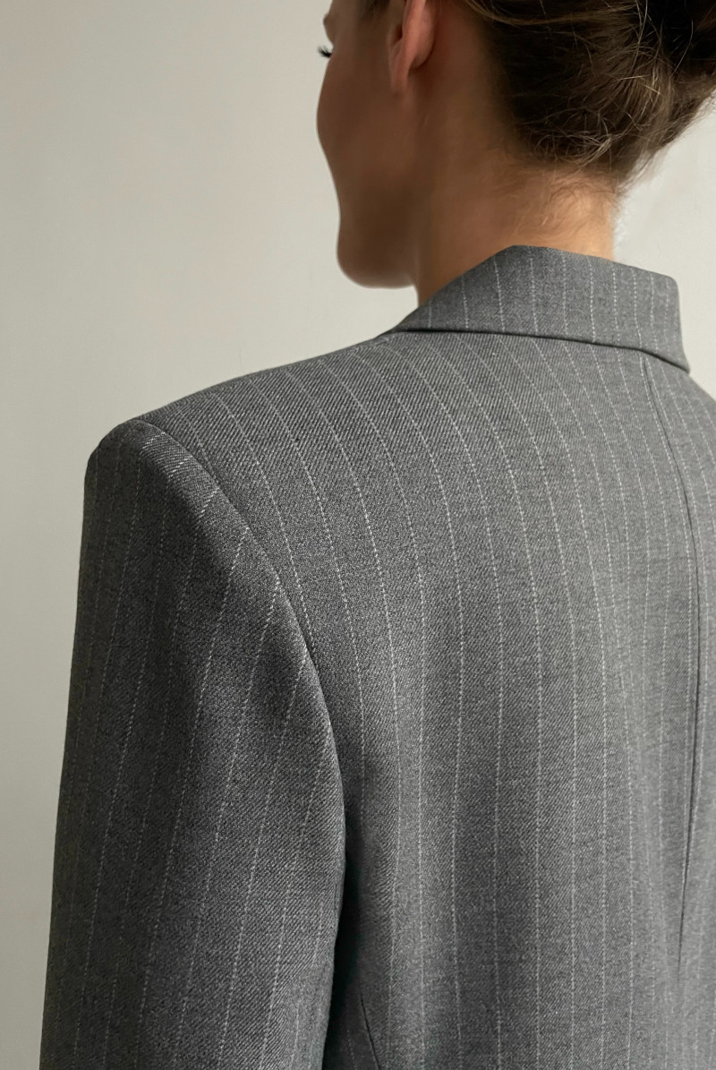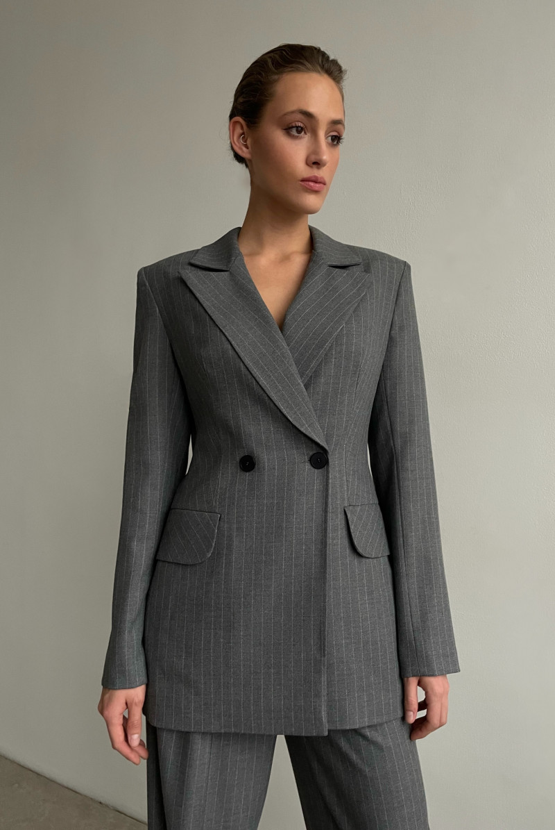 Двубортный жакет полуприлегающего силуэта с английским воротником. Рукав длинный. Карманы прорезные с клапанами.