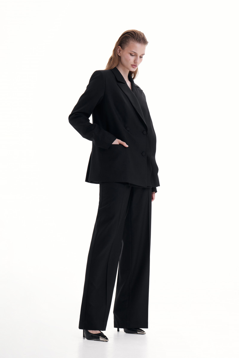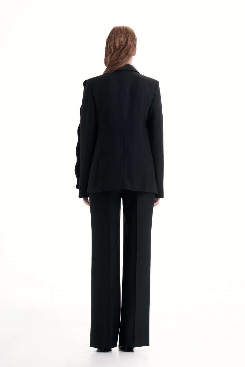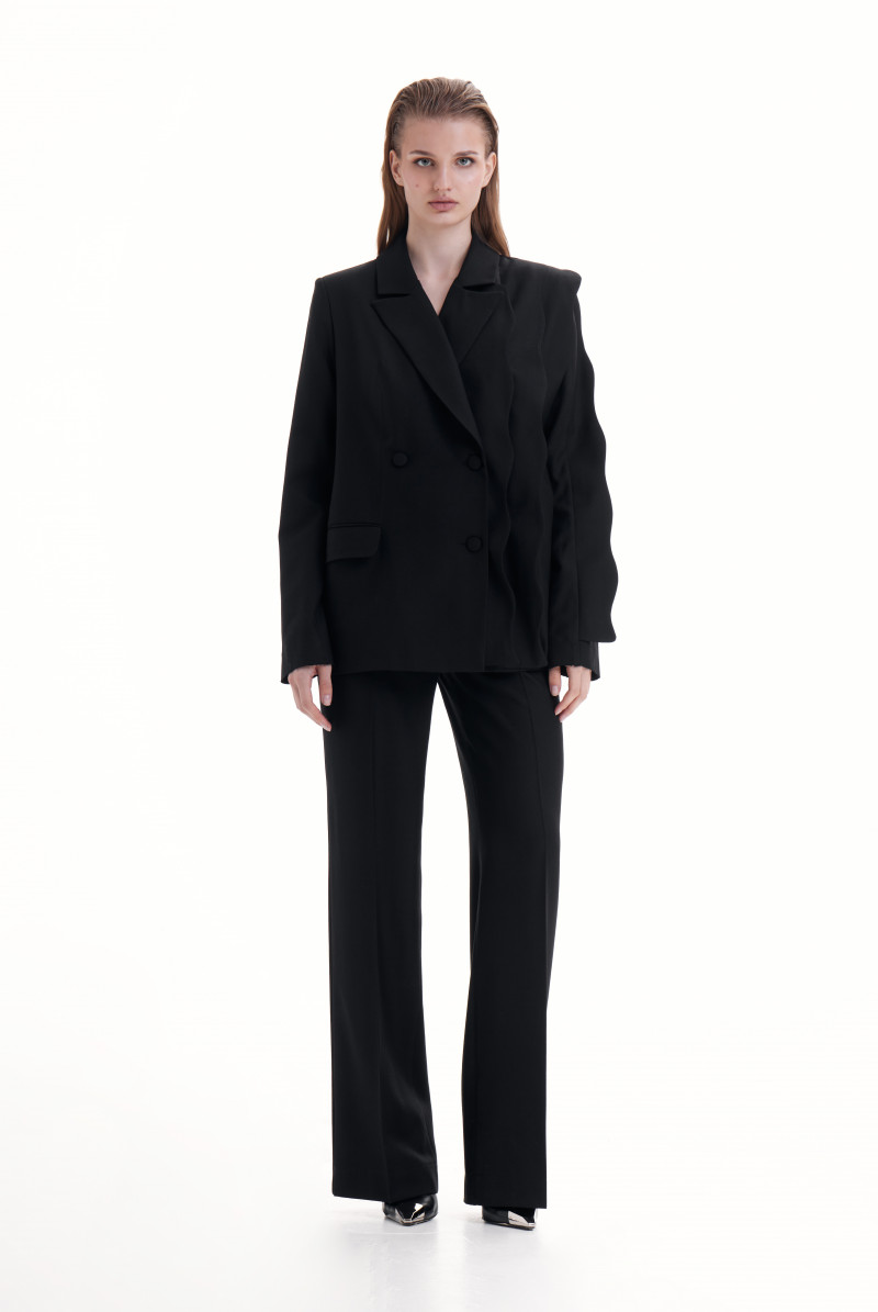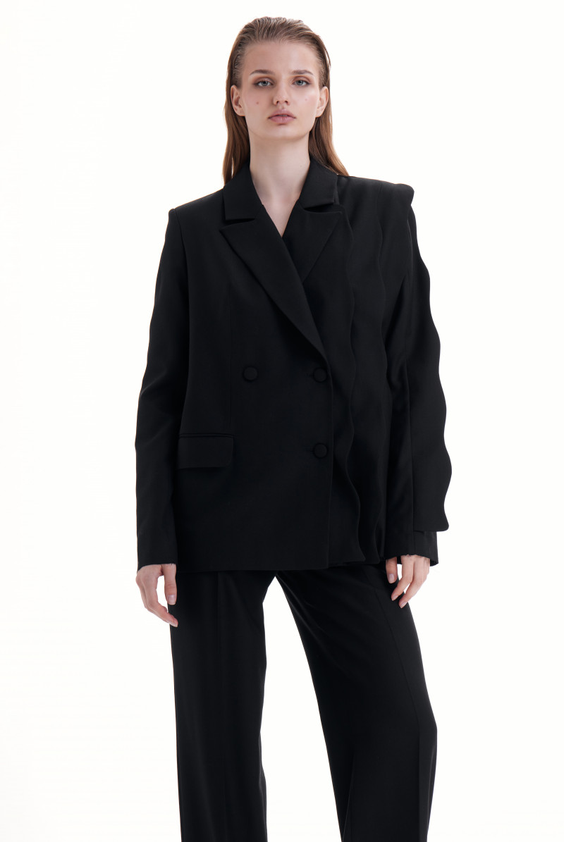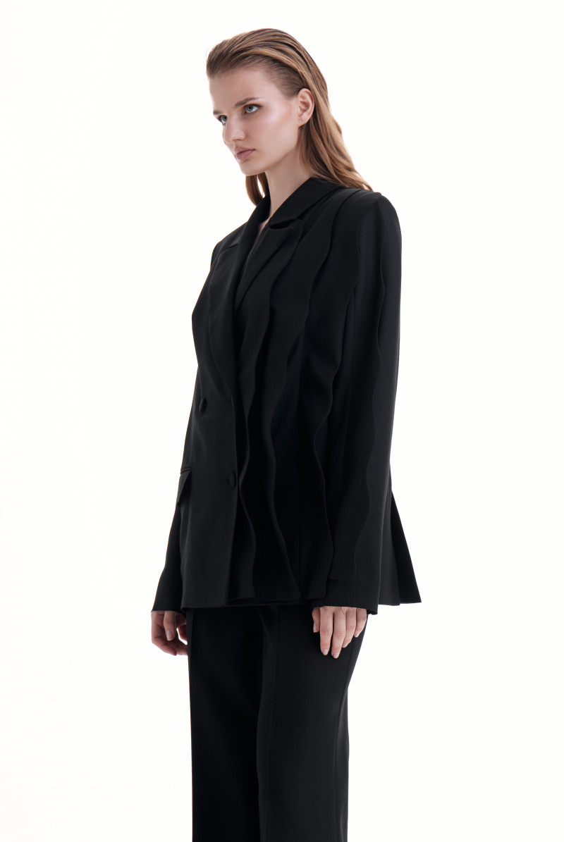 Двубортный удлиненный жакет среднего объёма. Воротник "английский". Рукав втачной. Сзади в рельефных швах - 2 шлицы. Левая полочка и левый рукав декорированы деталями в виде "волн" из основной ткани. На правой полочке расположен прорезной карман с клапаном.