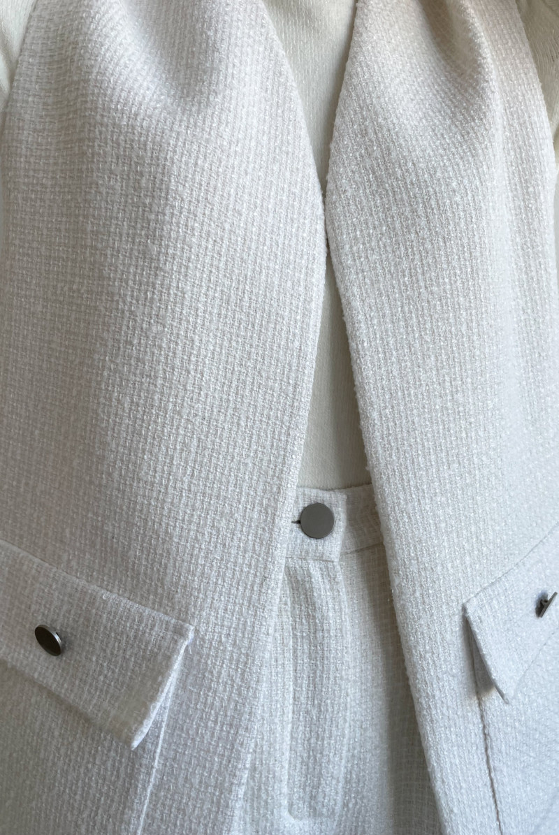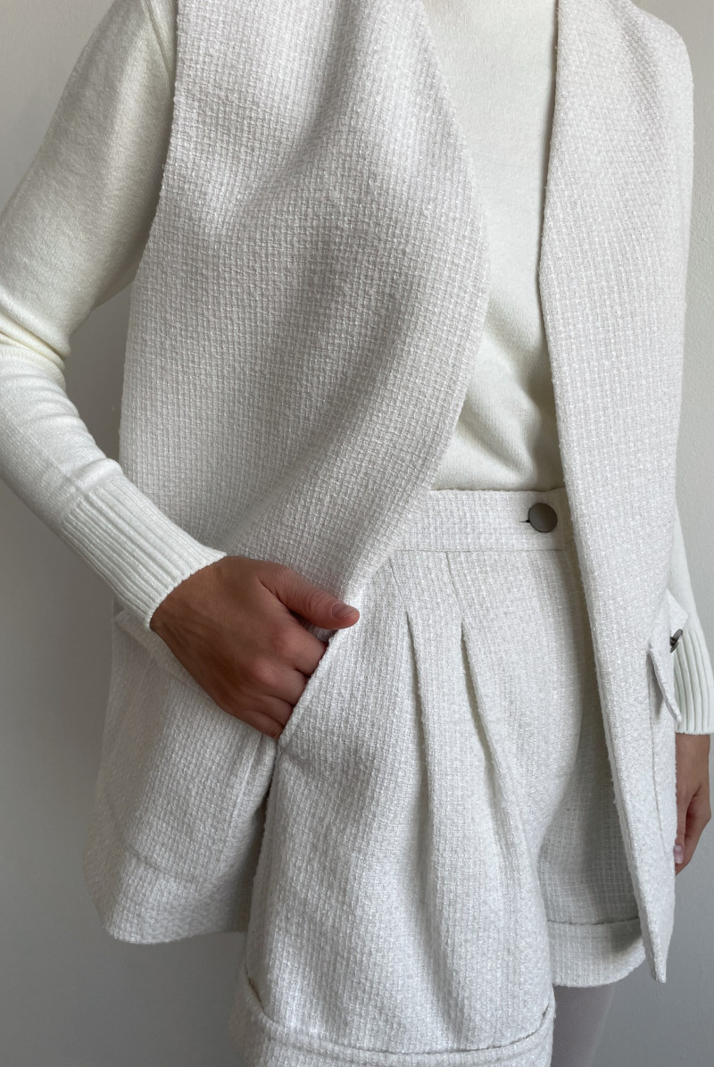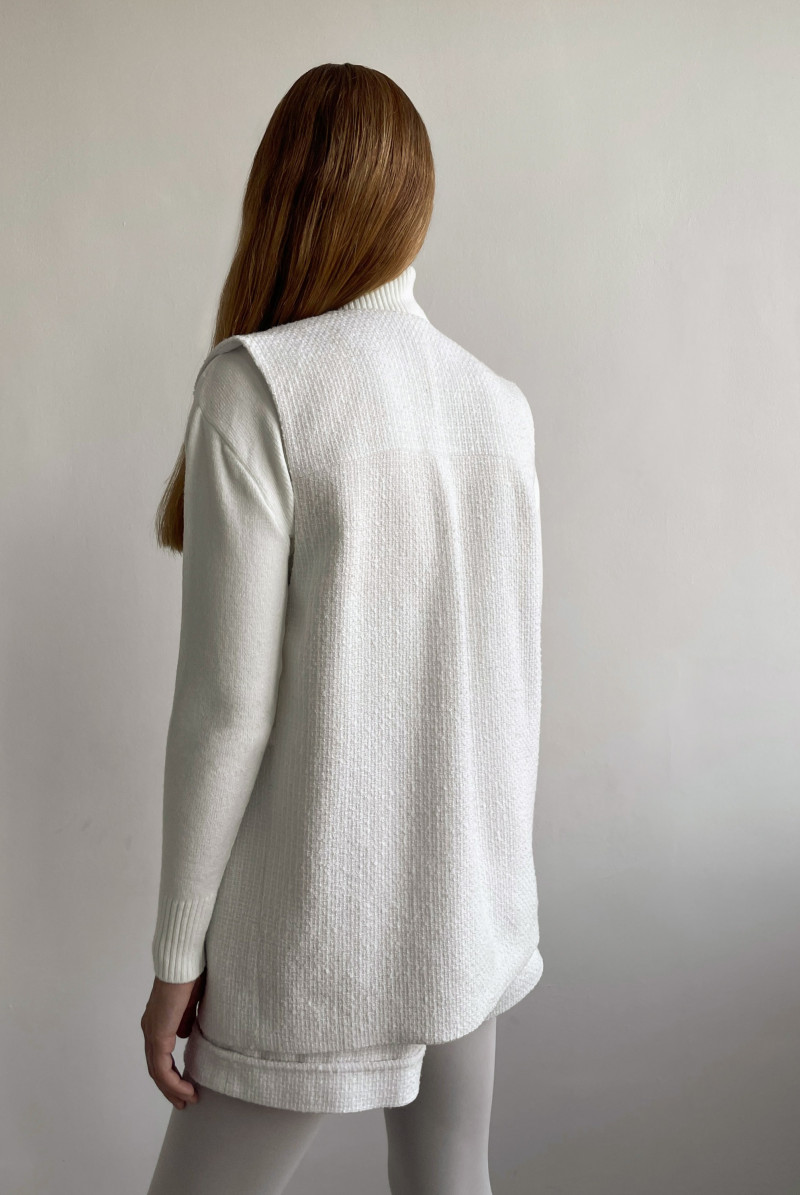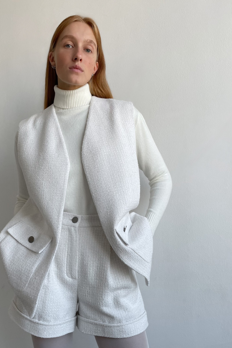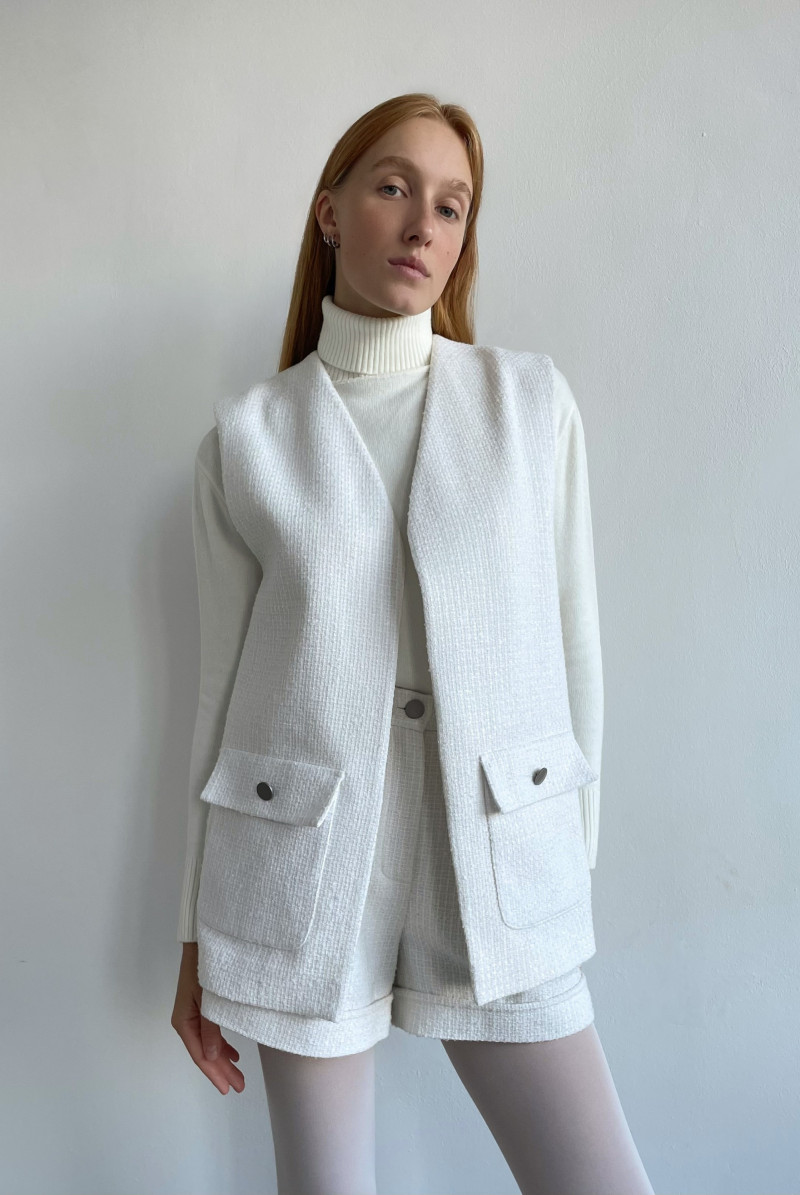 Жилет умеренного объёма прямого силуэта. Вырез V-образный. Спереди расположены накладные карманы с закругленными углами и клапанами. Сзади - кокетка, под которой расположена встречная складка. Жилет выполнен из твидовой ткани на притачной подкладке.