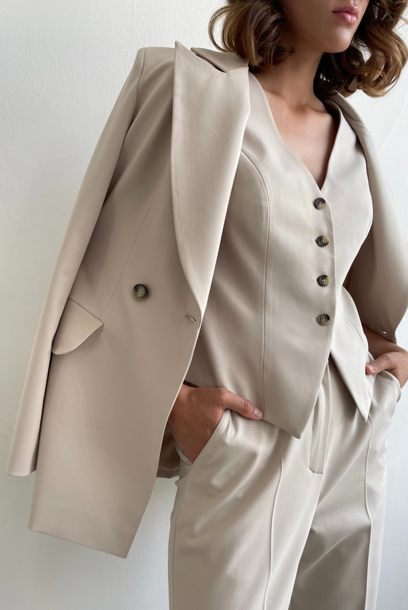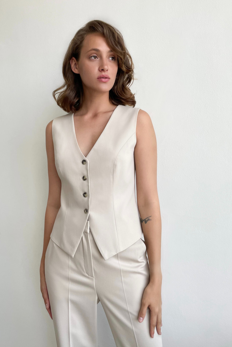 Жилет приталенного силуэта, выполнен из костюмной ткани, на подкладке. Вырез горловины глубокий V-образный. Застежка жилета - на пуговицы.