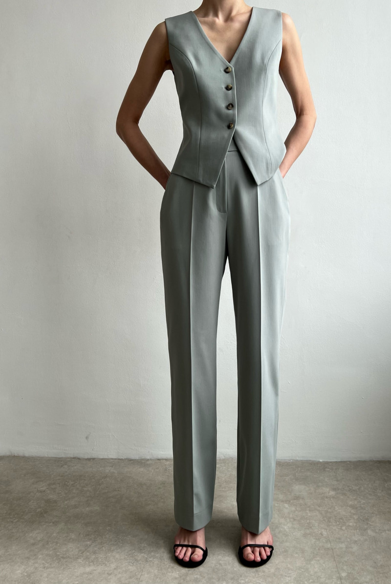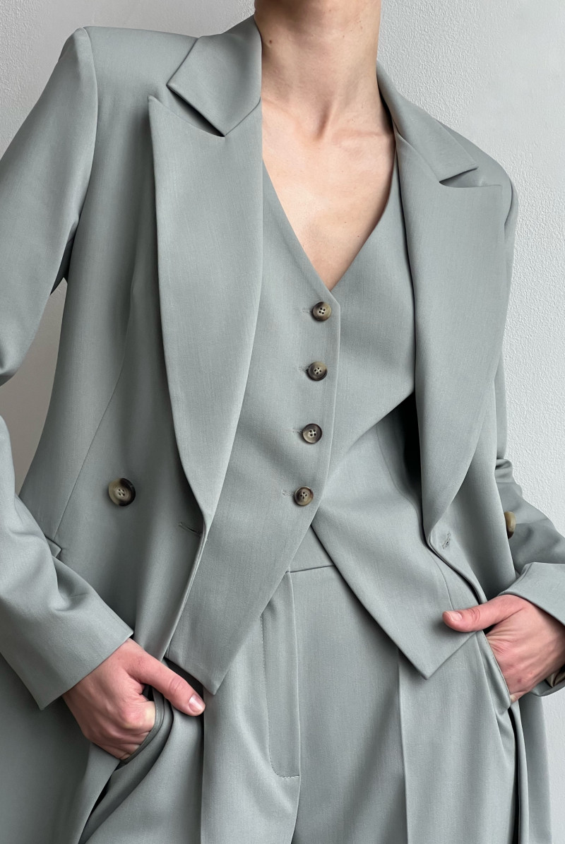 Жилет приталенного силуэта, выполнен из костюмной ткани, на подкладке. Вырез горловины глубокий V-образный. Застежка жилета - на пуговицы.