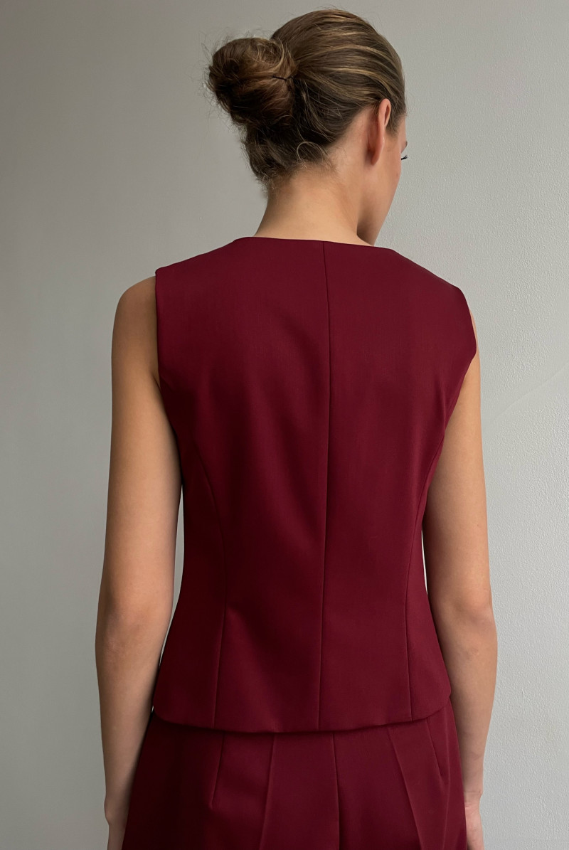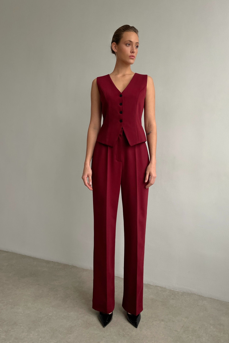 Жилет приталенного силуэта, выполнен из костюмной ткани, на подкладке. Вырез горловины глубокий V-образный. Застежка жилета - на пуговицы.