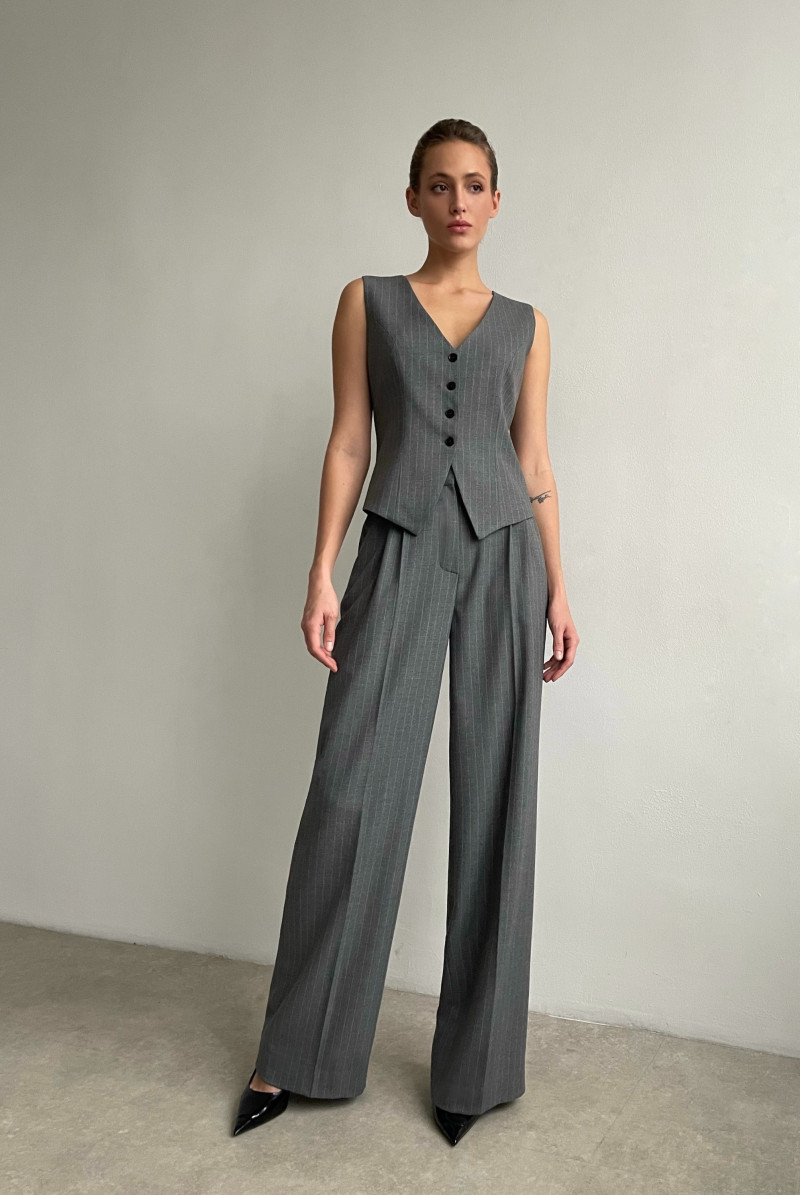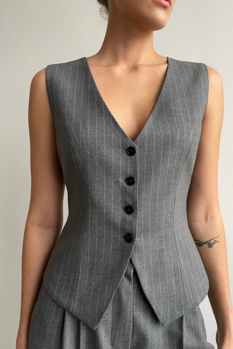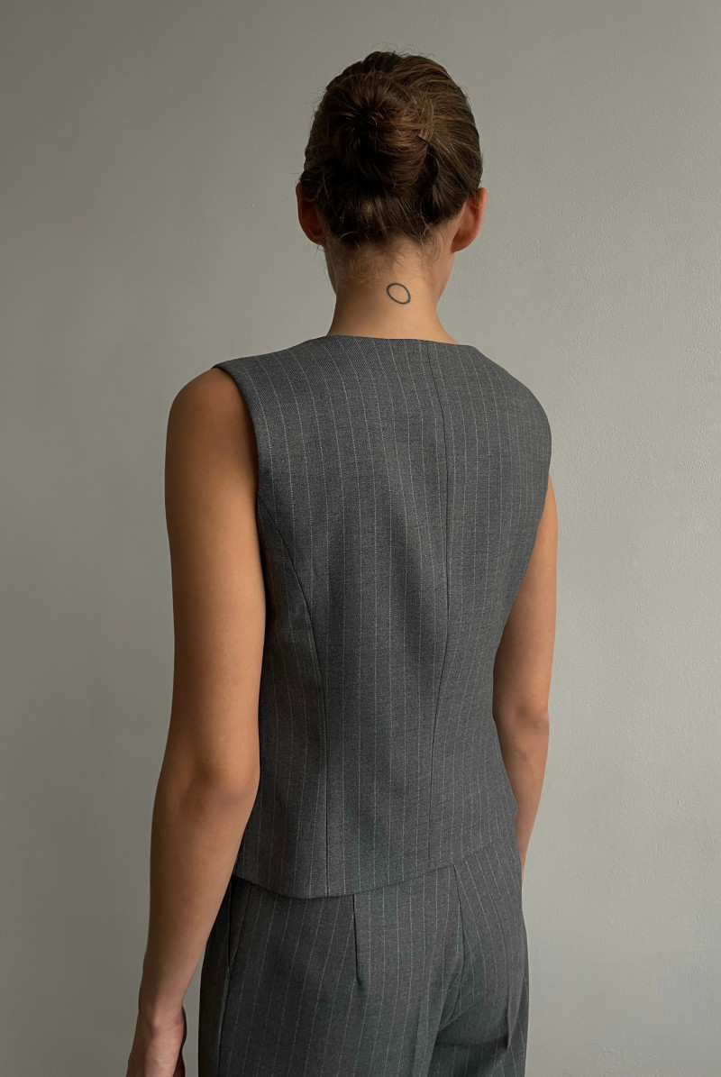 Жилет приталенного силуэта, выполнен из костюмной ткани, на подкладке. Вырез горловины глубокий V-образный. Застежка жилета - на пуговицы.