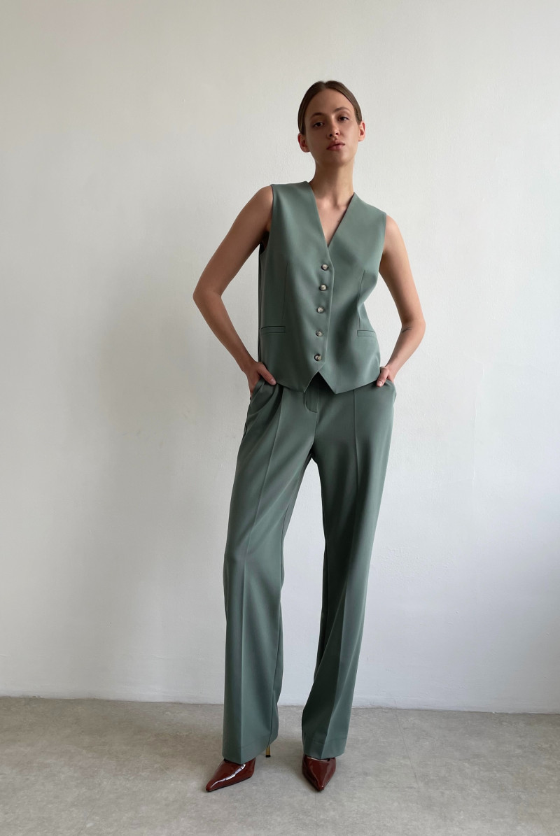Жилет женский прямого силуэта с застёжкой на пуговицы по центру переда. Фальш-карманы, низ жилета фигурный по переду и спинке.