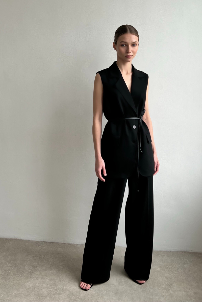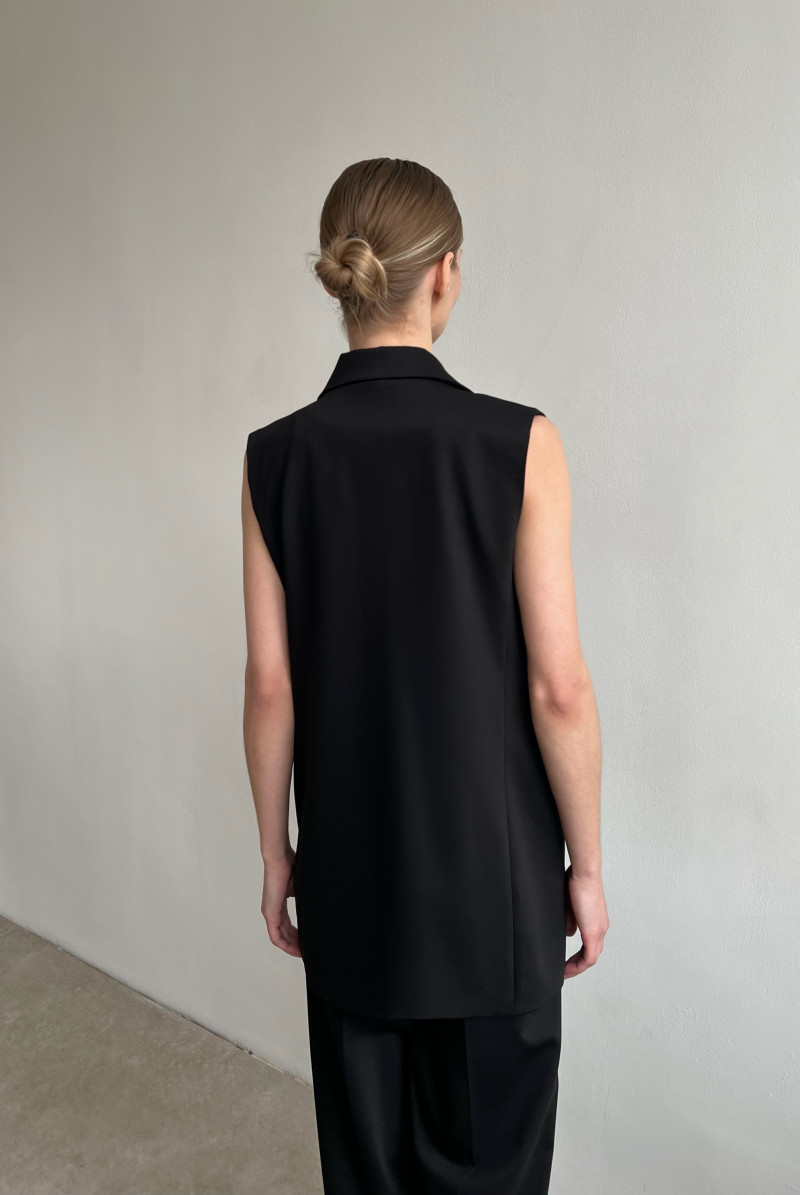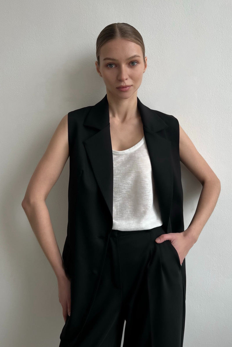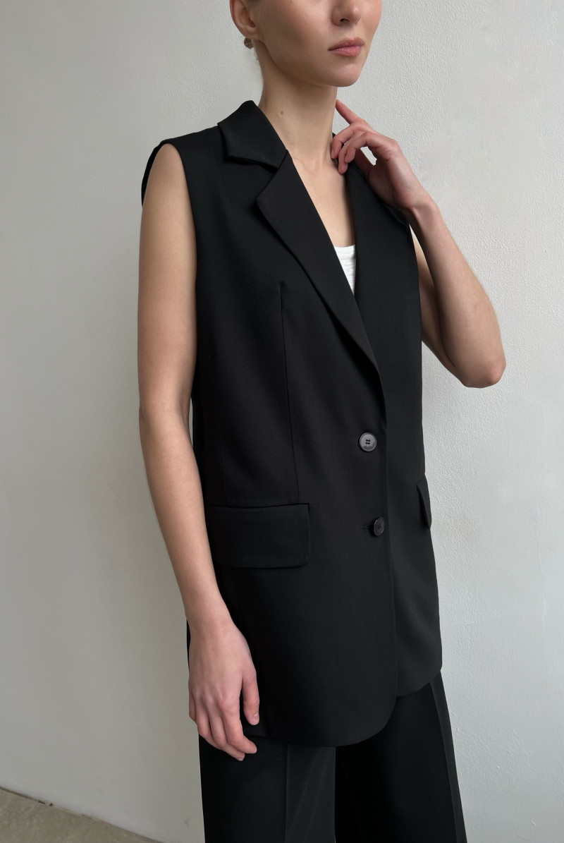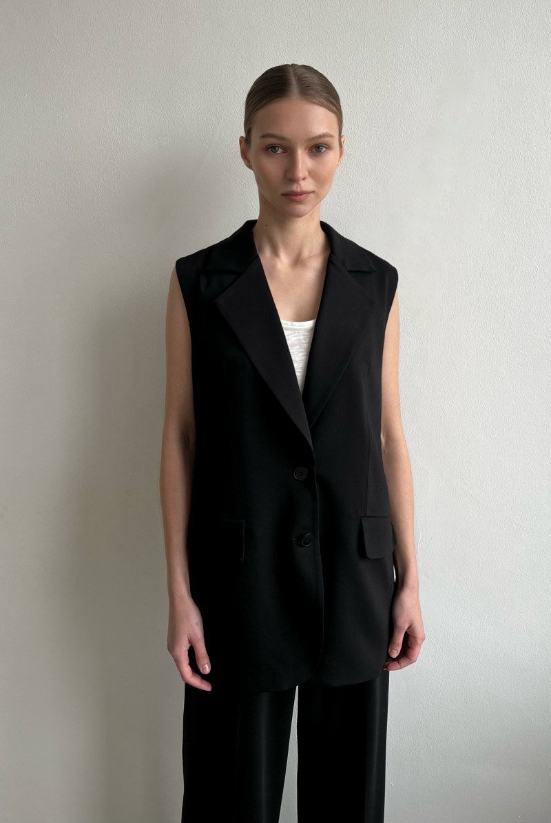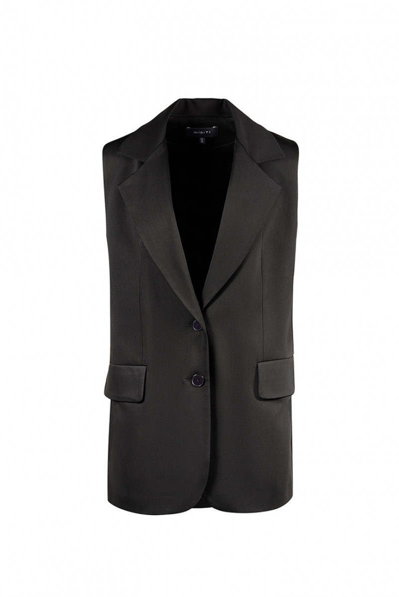 Удлинённый жилет прямого силуэта. Жилет однобортный с застежкой на 2 пуговицы. Воротник английский, карманы с клапанами.