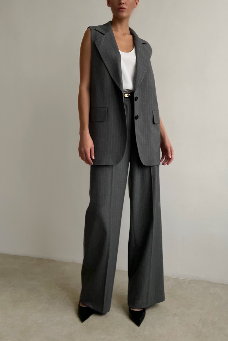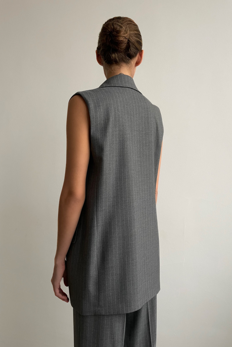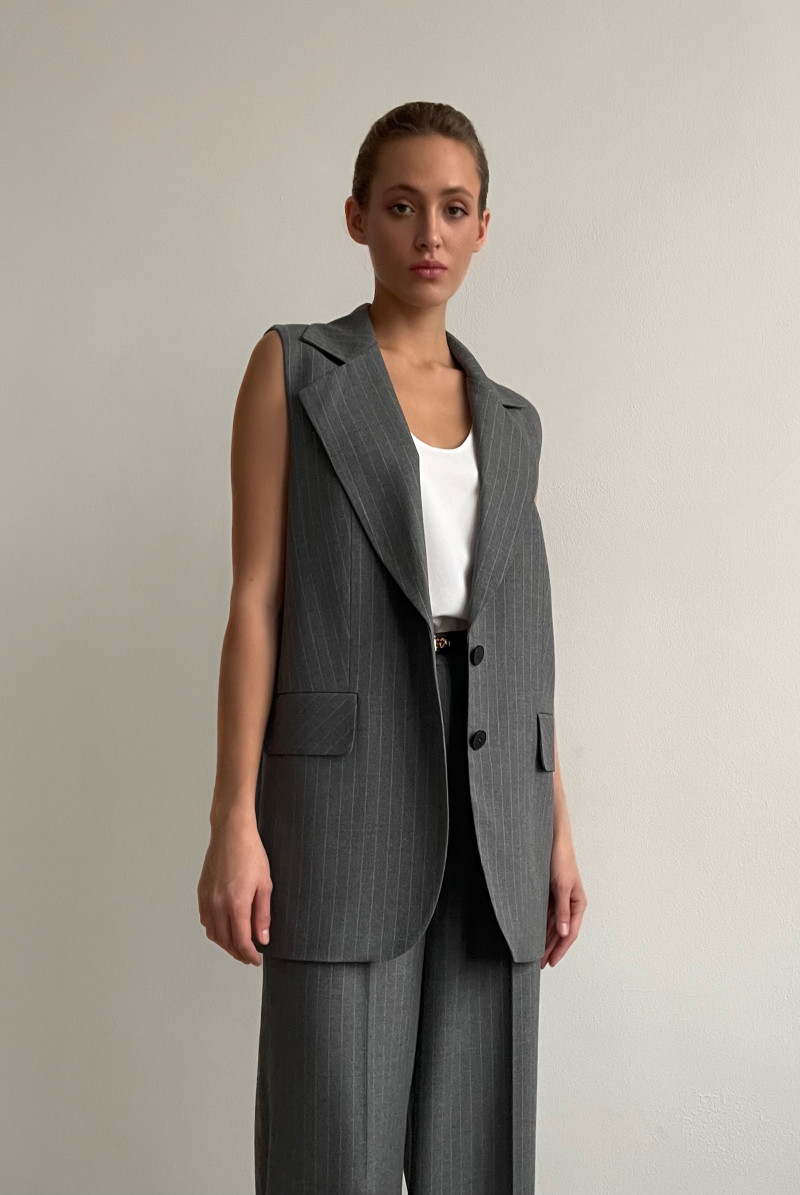 Удлинённый жилет прямого силуэта. Жилет однобортный с застежкой на 2 пуговицы. Воротник английский, карманы с клапанами.